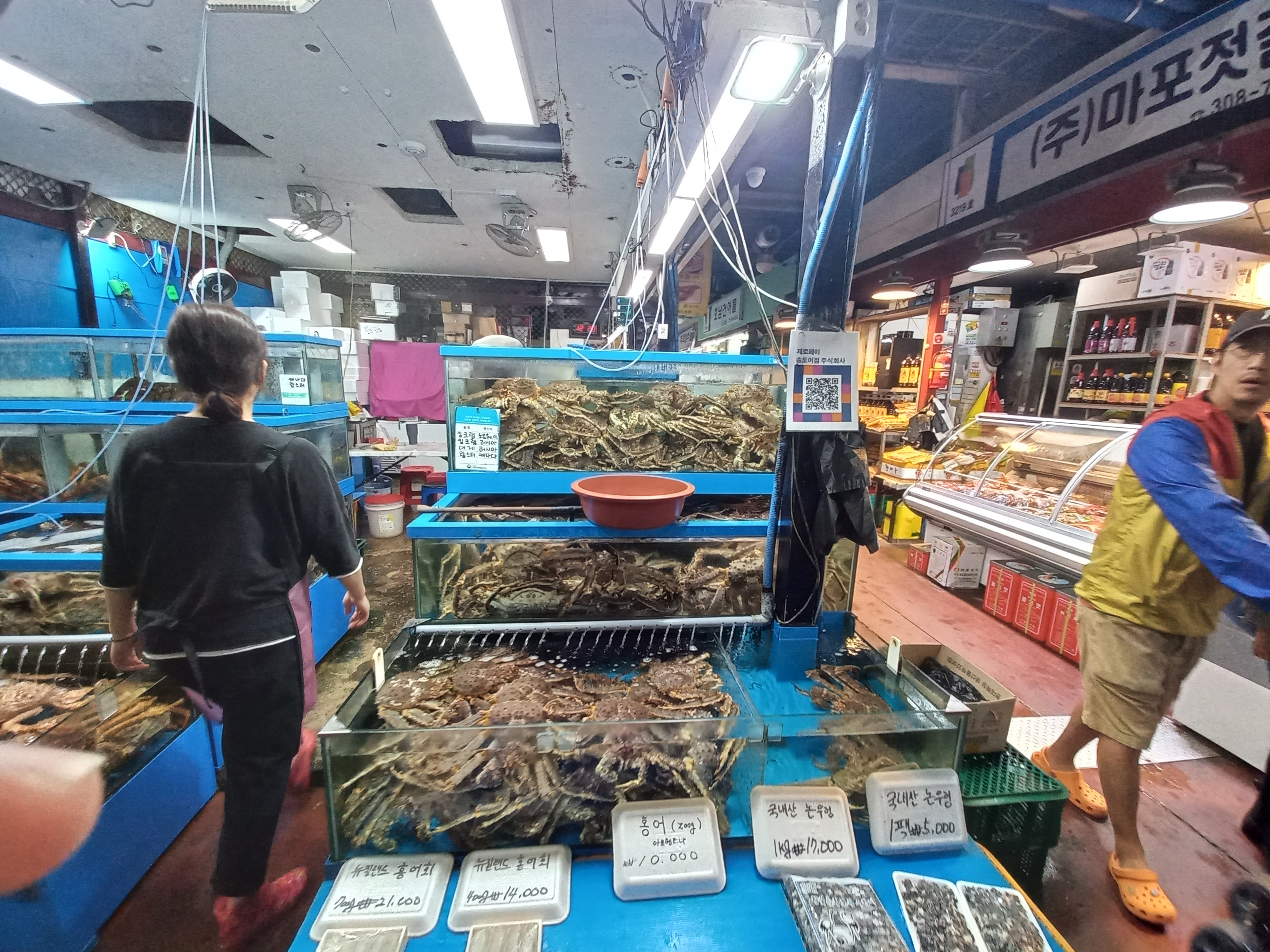 킹크랩을 합리적인 가격에 판매하는 곳은 시장 입구와 가까워 접근성이 좋아요. 구매한 킹크랩을 바로 삶아주기 때문에 시장에서 가장 먼저 방문하여 주문해놓고 장을 보고 오는 것도 괜찮습니다. 삶은 킹크랩은 포장해가거나 양념집에서 곧바로 먹을 수 있고요. 수산 매장 2층에 넓게 자리 잡고 있는 양념집 ‘마포회관’은 상차림비만 내면 수산 매장에서 구매한 수산물을 손질해주고 매운탕도 제공해줍니다.