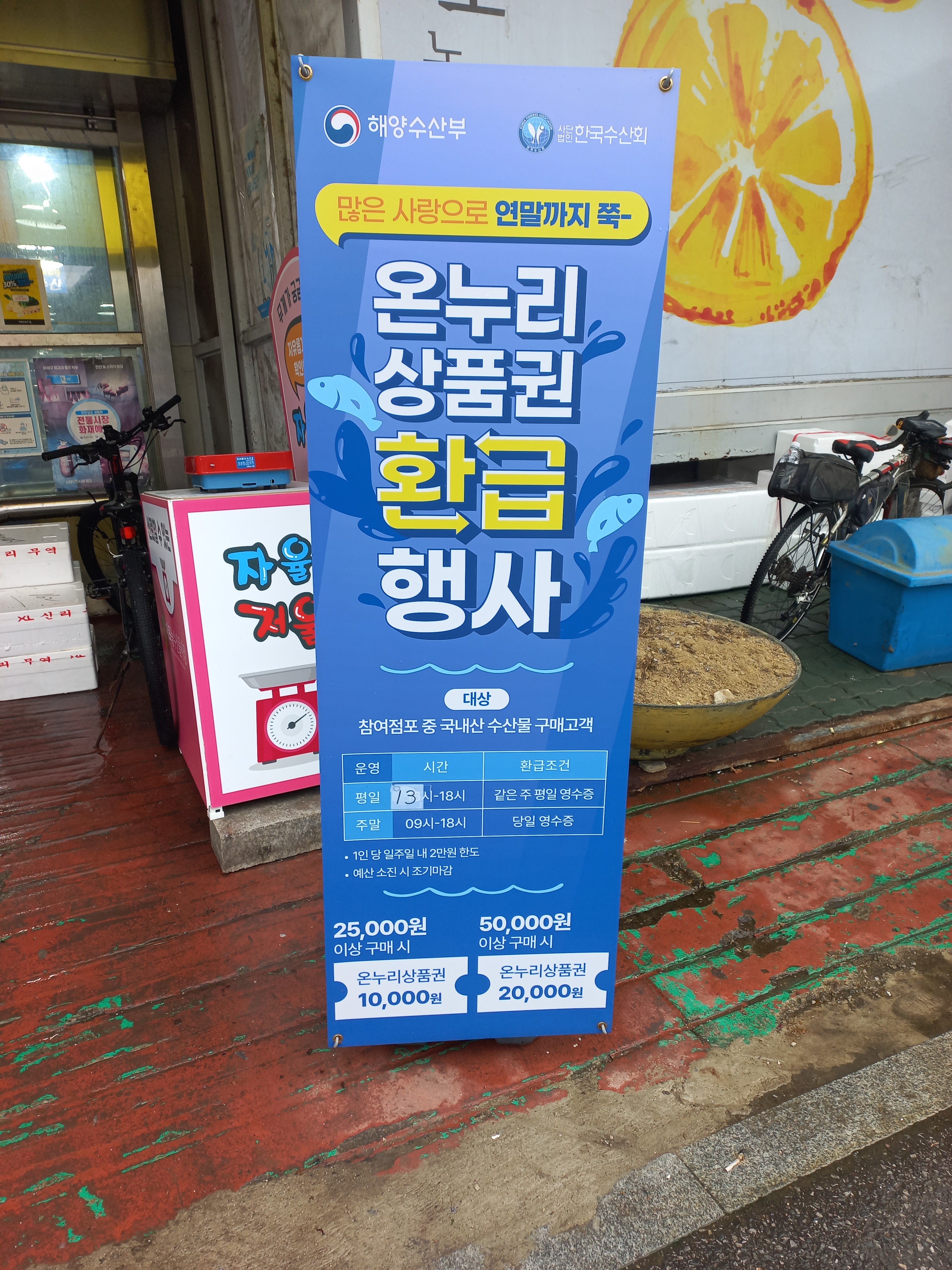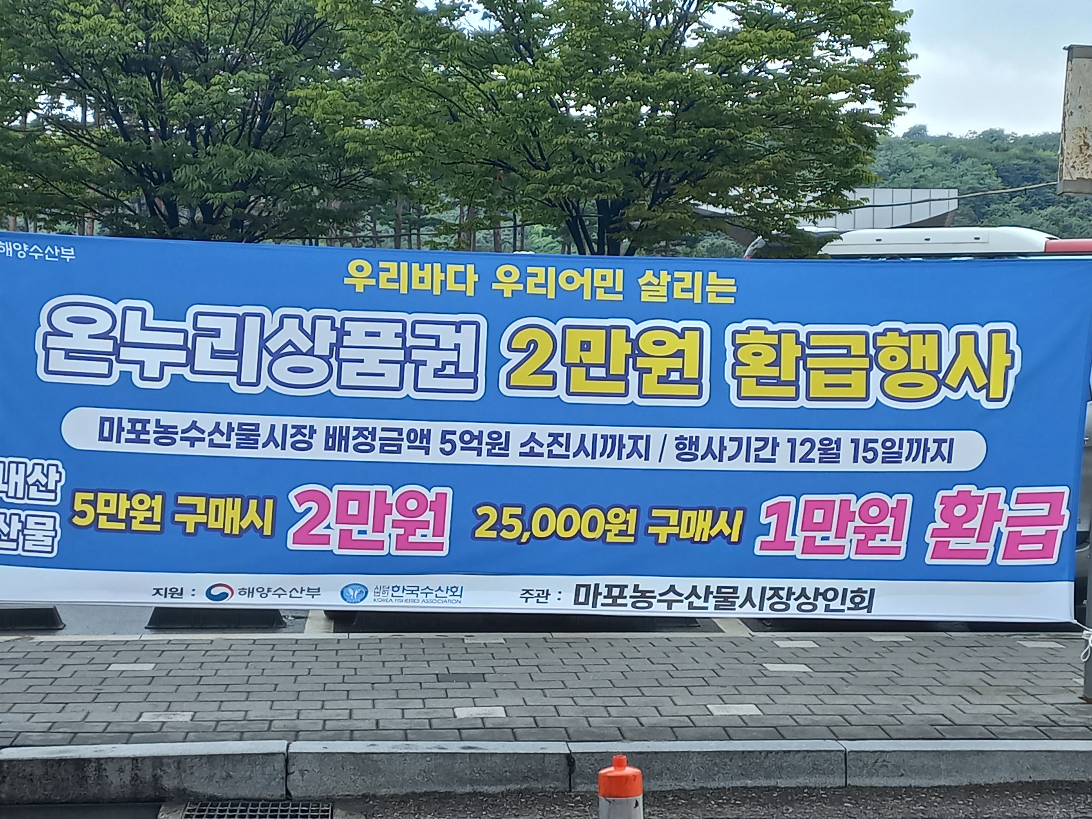 국내산 회를 구매하고 영수증을 받는 등, 우리 수산물을 구매하면 40% 금액을 온누리상품권으로 돌려준다고 합니다.